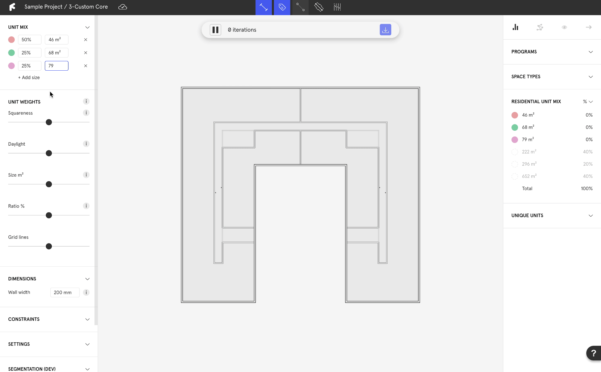 Need large apartments on the outer facade and smaller apartments optimized for daylight on the inner facade? Split the building into an outer and inner section by drawing walls, and run two generations. Request a large unit mix for the exterior section and a smaller unit mix optimized for facade/floor area ratio (daylight) for the interior section.