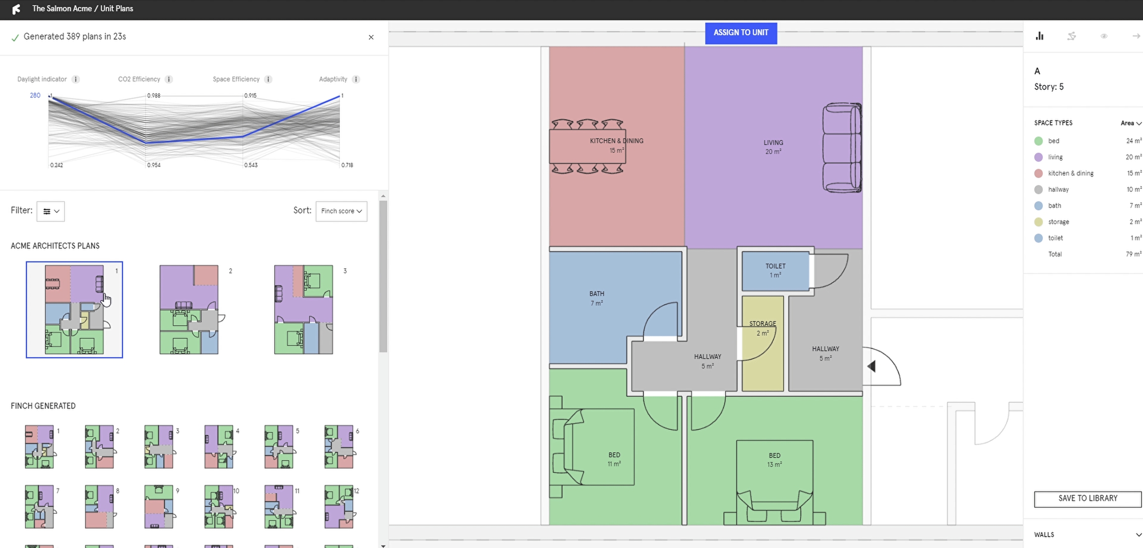 (i)icon to see the metric definition.Filteraccording to bedroom / bathroom counts and dataset locations.Sortaccording to overall score, or specific metrics such as daylight, CO2 and more.Once the desired plan has been located, select